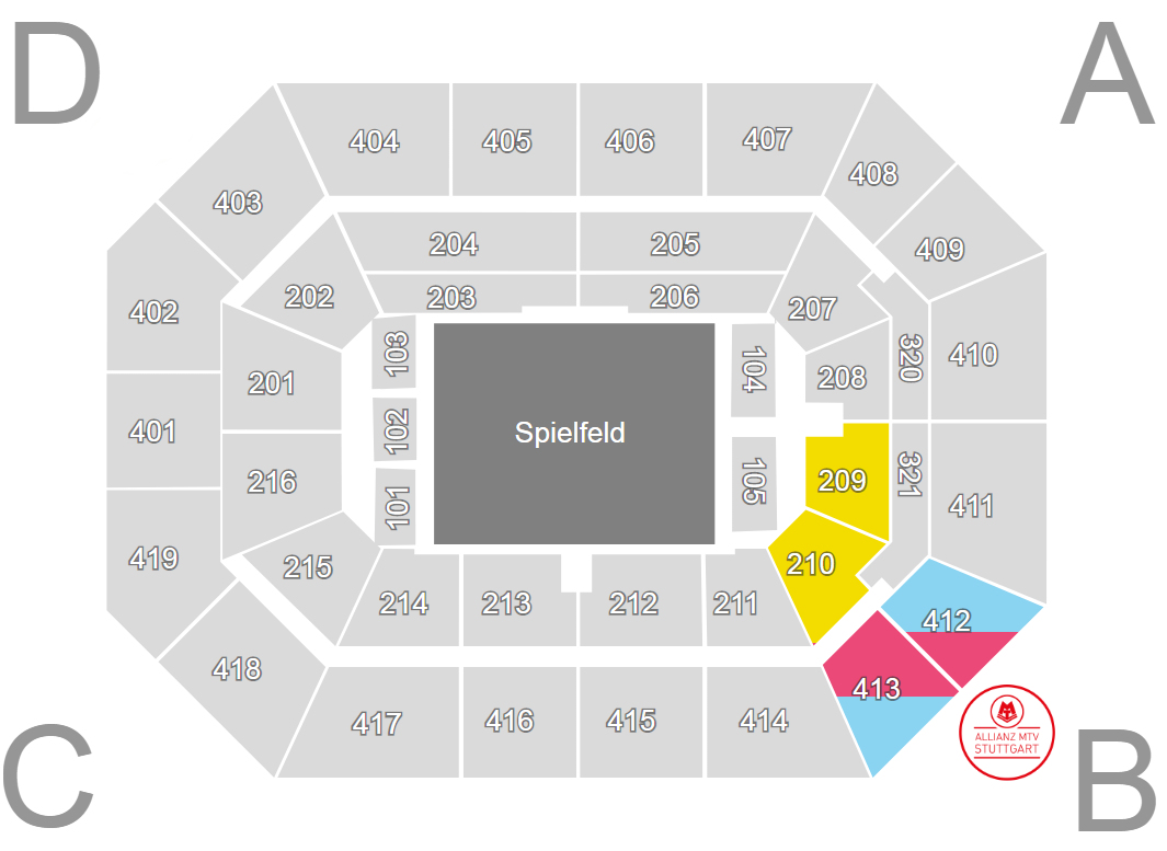 Im Unterrang befinden sich die Plätze der Blöcke 209 und 210. Zum preislich sehr attraktiven Oberrang gehören die Blöcke 412 und 413.
