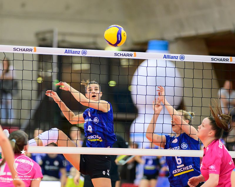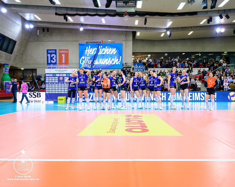 Auch im dritten Satz erwischte Allianz MTV Stuttgart den besseren Start und ging schnell mit 4:0 in Führung. Den Vorsprung von vier Punkten verteidigten die Gastgeberinnen zunächst bis zum 9:5, ehe Wiesbaden auf 11:10 verkürzen konnte. Doch Allianz MTV Stuttgart hatte die passende Antwort, denn mit Mikala Morgensen am Aufschlag gelangen drei Punkte in Serie zur 16:11-Führung. Nach einer spektakulären Abwehr von Yurika Bamba in der entscheidenden Phase machten Pauline Martin und Lucia Varela Gomez mit einem Block den Matchball perfekt. Den Schlusspunkt setzte schließlich ein zu weiter Angriffsschlag der Wiesbadenerinnen. Der dritte Satz ging somit ebenfalls mit 25:17 an die Gastgeberinnen.